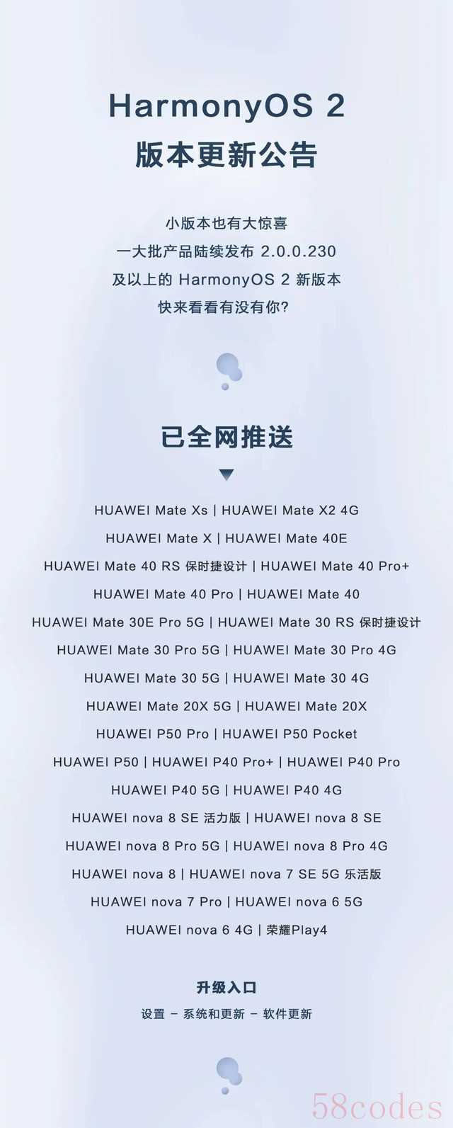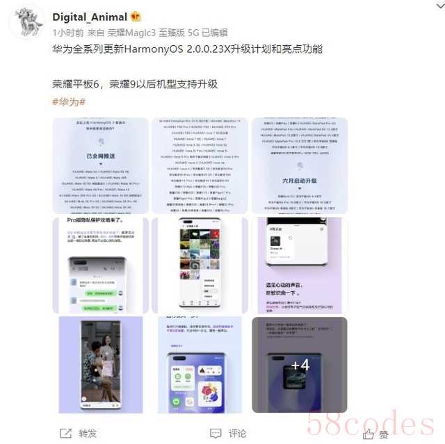今日,数码博主@Digital_Animal曝光了华为全系列更新HarmonyOS 2.0.0.23X升级计划和亮点功能。公告显示华为Mate Xs以及华为P50 Pocket等新机都已全网推送,其中还包含荣耀Play 4。