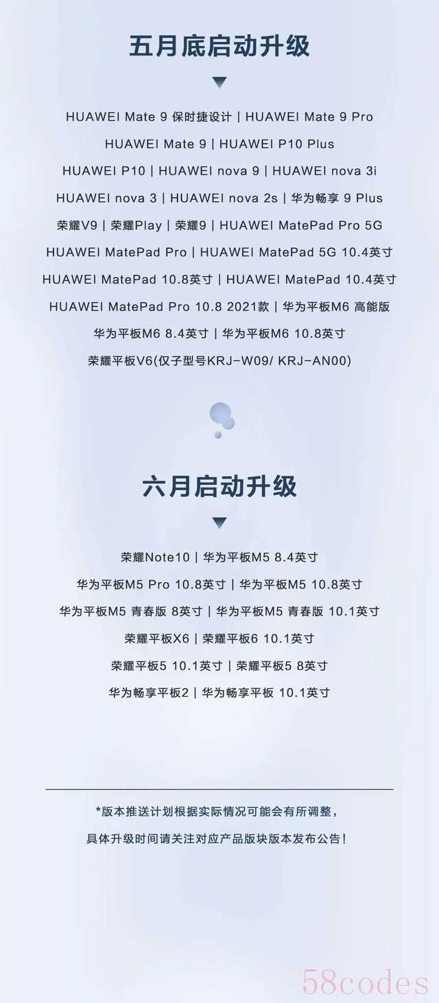 值得注意的是,后续更近计划中包含的机型更为全面,荣耀平板6、荣耀9以后机型都在更新列表中。
