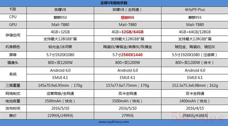 通过表格对比我们看到,荣耀V8全网通版与运营商版(支持移动联通双4G)最大的区别在于高配版采用麒麟955处理器(标准版为麒麟950),配备2K屏幕(运营商为1080p),并支持NFC(运营商版本不支持NFC)。