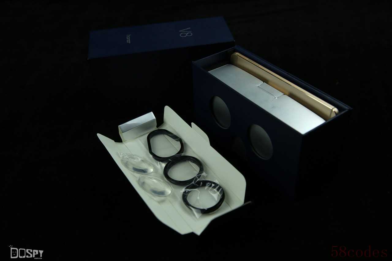荣耀V8的包装盒上印制了制作VR的过程图解,包装盒中也包括了两枚镜片、两块橡胶镜片环,一个鼻垫。