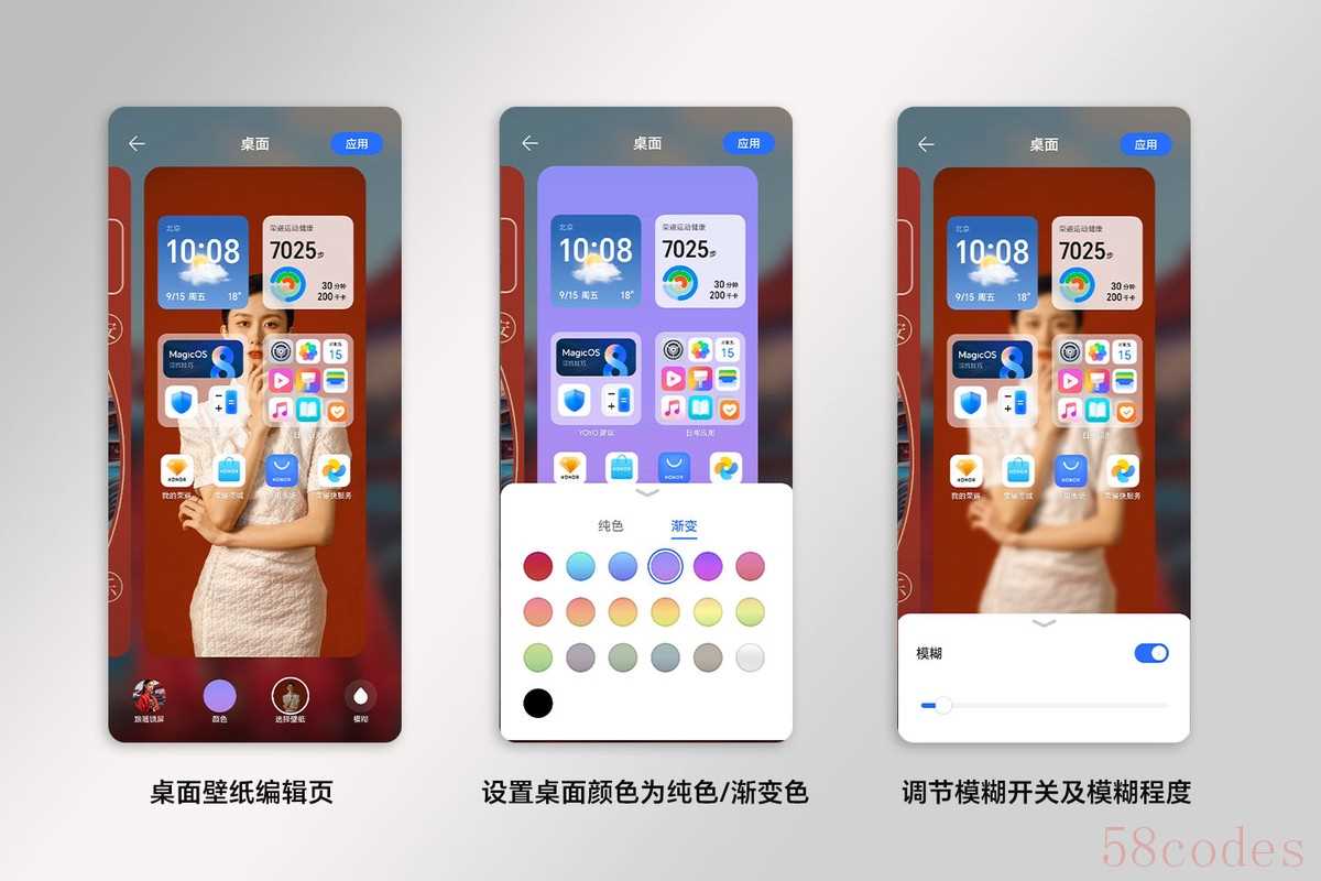 1.跟随锁屏 选择此选项时,桌面壁纸将跟随锁屏壁纸;2.颜色 选择此选项时,桌面壁纸设置为纯色和渐变色,桌面内容展示更简洁;3.选择壁纸 您可自定义选择照片作为桌面壁纸;