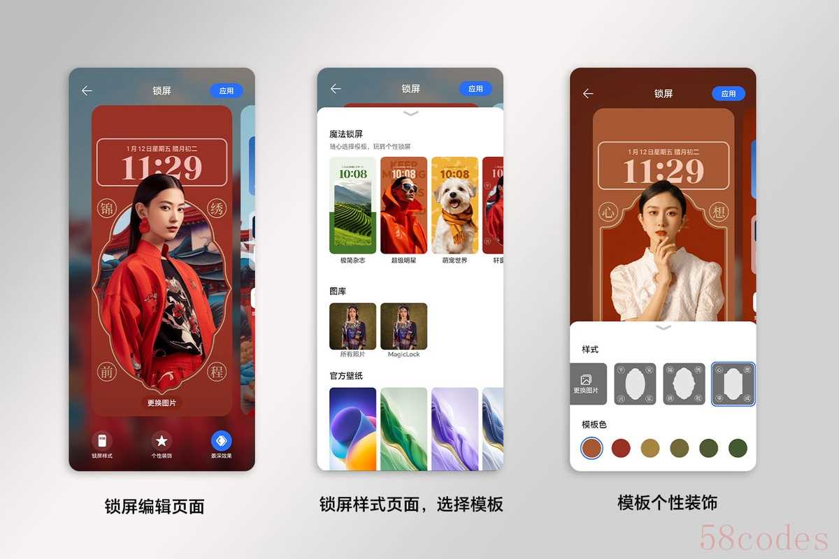 1、锁屏样式 在锁屏编辑界面, 点击【锁屏样式】,您可从【魔法锁屏】下的模板、图库、官方壁纸等锁屏样式中选择设置您的锁屏;2、选择模板 您可通过选择模板、更换图片、个性装饰来自定义生成您喜欢的锁屏1)更换模板:点击【锁屏样式】,在魔法锁屏下选择模板;2)更换图片:点击【更换图片】,在相册中选择自己喜欢的图片与模板搭配;3)个性装饰:点击【个性装饰】,选择您喜欢的样式和模板色来装饰自己的锁屏,不同模板有不同的装饰供您选择搭配;不同产品支持模板不同,具体以实际为准。