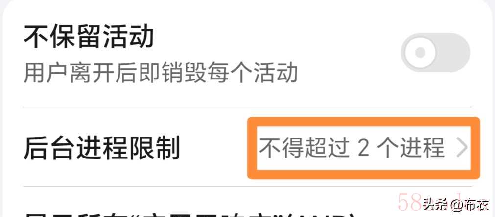 来到开发人员选项这里,在下方一点,有个后台进程限制,我们给它设置,不得超过2个进程,这样手机的流畅度更好。