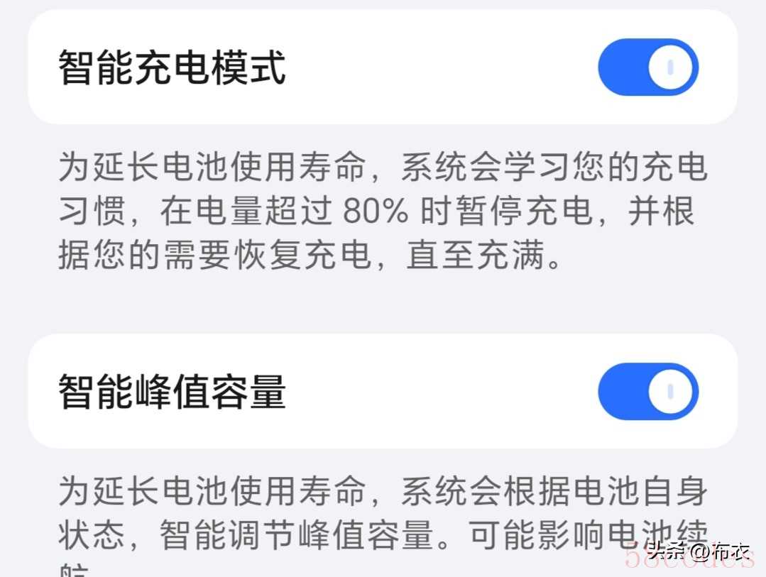 接下来把智能充电模式打开,把智能峰值容量打开,这样会延长电池寿命,
