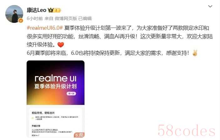 另外,realme UI产品经理康达发文称:“realme UI 6.0夏季体验升级计划第一波来了,为大家准备好了两款限定水印和很多实用好用的功能,丝滑流畅、满血AI再升级!这次更新量非常大,欢迎大家陆续升级体验。”