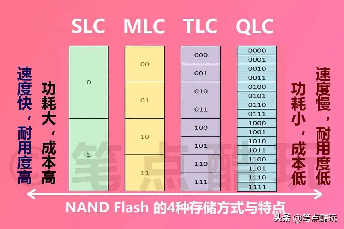 NAND芯片也有代际分类,比如按照存储方式分为SLC、MLC、TLC和QLC等等。老玩家都知道SLC和MLC香且贵,目前已经退出消费级市场,主流市场多为TLC,最近也有大量主打亲民价的QLC进入。二者共性都是成本低、功耗小,可以用亲民价格买到容量更大的型号,但QLC寿命与性能逊于TLC,下图一图看懂。
