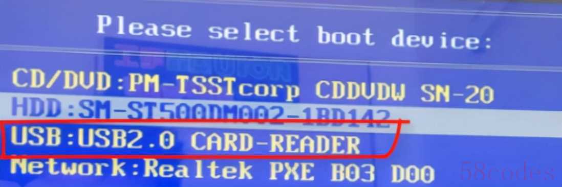 5、然后我们将启动u盘插入你想要安装的电脑,打开电脑后一直按u盘启动热键(一般为“F8、F12”),如果你不知道的话可以上装机吧进行查询,然后选择USB:USB2.0 CARD-READER按下回车键即可。