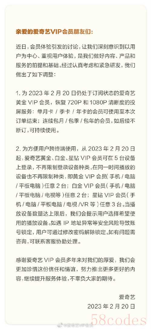 2月20日,爱奇艺VIP会员官方微博发布公告,为2023年2月20日仍处于订阅状态的爱奇艺黄金VIP会员,恢复720P和1080P清晰度的投屏服务。此外,即日起,爱奇艺黄金、白金、星钻VIP会员可在5台设备上登录,不再限制登录设备种类,在同一时间播放的设备也不再限制种类。当播放设备数量达上限后,会提示用户选择希望使用的播放设备。