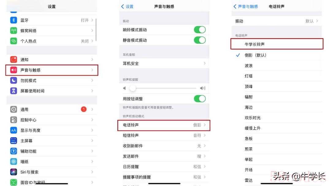 步骤5:错过了在铃声导出成功提示框中的快速设定铃声,只需点开【设置】-【声音与触感】-【电话铃声】。