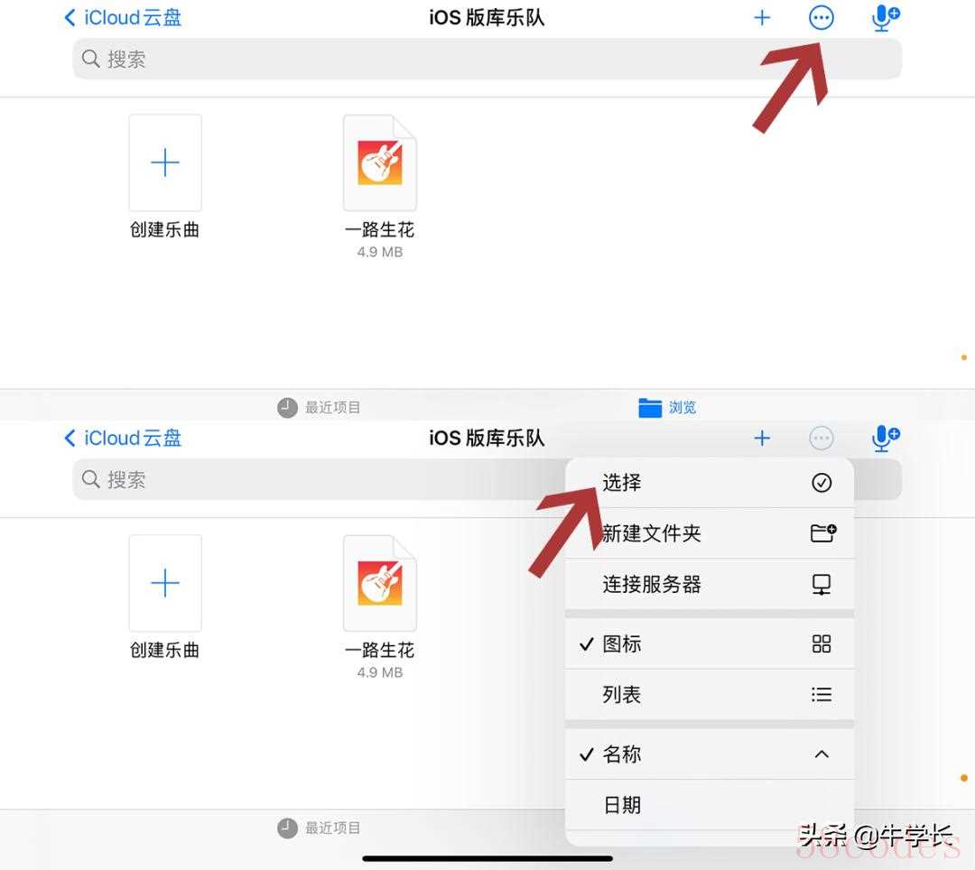 步骤3:在库乐队App中找到已下载好的铃声,再点击页面右上角的三点圆圈,点击“选择”,再勾选铃声,再点击左下方的分享按钮。