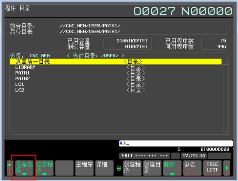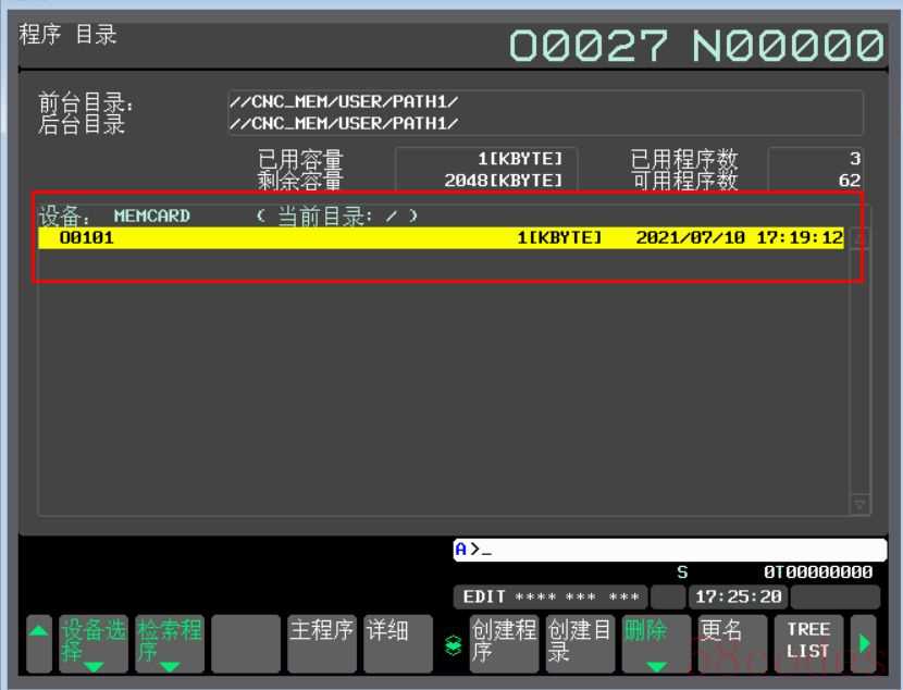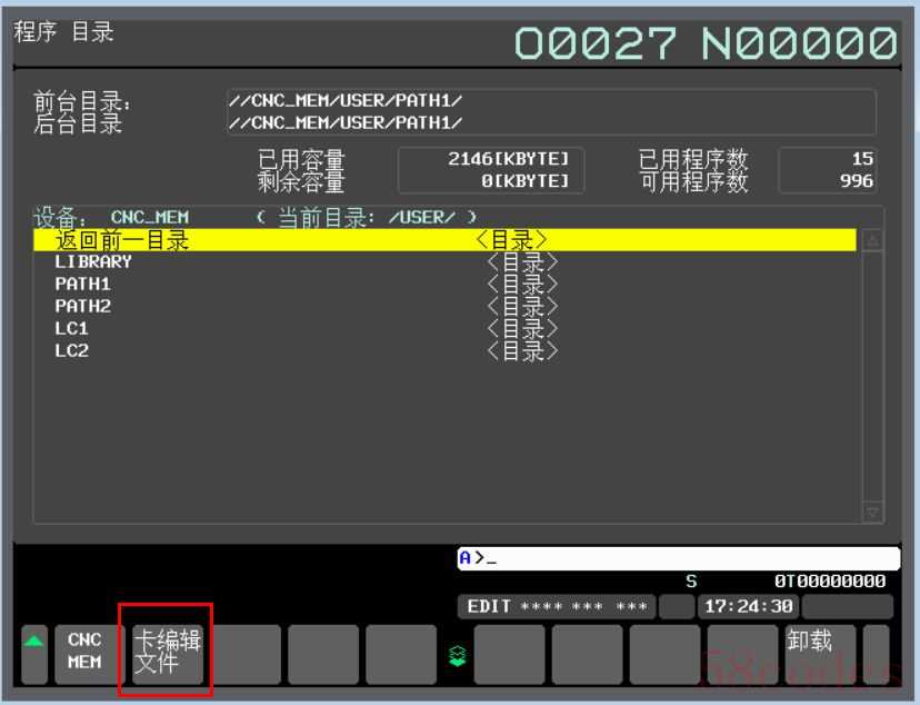 6、CF卡插入后,按下MDI面板上的“PROG”按键,然后依次点击“目录”→“操作”→“设备选择”→“卡编辑文件”,进入到存储卡程序选择界面。
