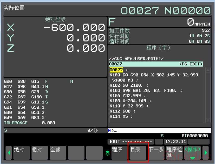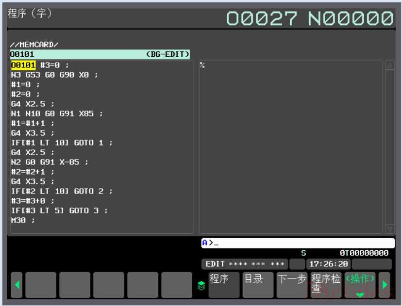 7、我们用方向键将光标选中我们想要编辑的程序,然后点击MDI面板上的“INPUT”按键,便可以对CF卡上的程序进行编辑了。