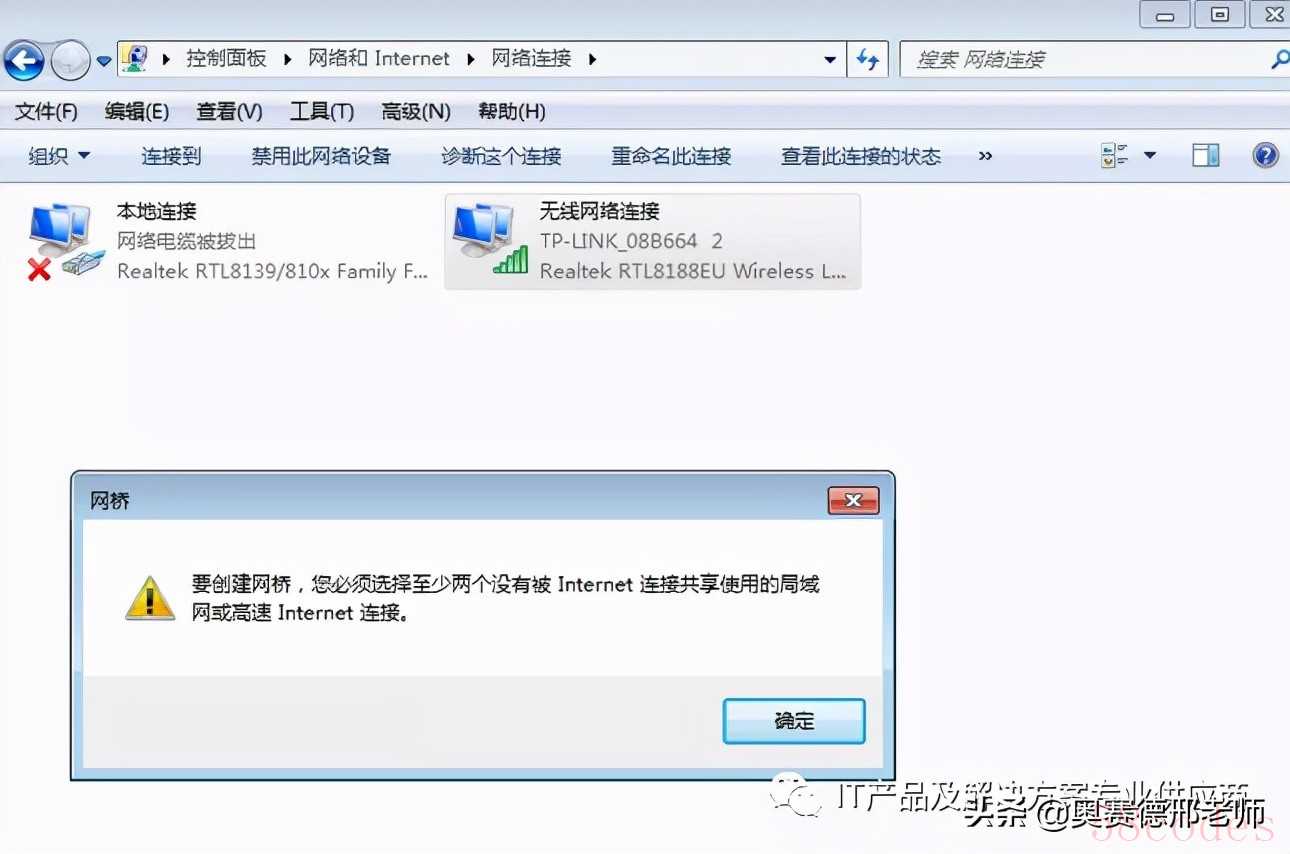 1、设置桥接时,一定要全选两个需要桥接的网卡,不然会遇到提示: