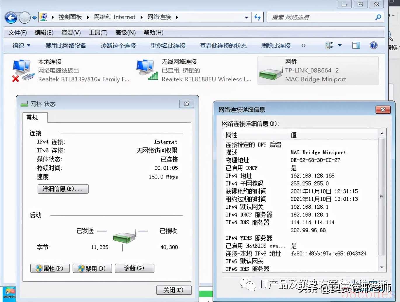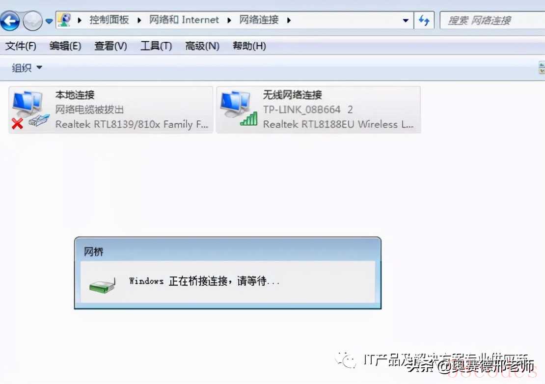 等一会就连接成功了,连接成功的界面是下面这样子的,界面上会多一个叫网桥的设备,该网桥自动获得一个IP地址,这个地址就是这个笔记本电脑使用的IP地址了,访问这个笔记本电脑就是用这个IP地址,这个地址和原先无线网卡获得地址是不同的,也就说网桥会自动获得一个新的IP地址,既不是有线网卡的地址,也不是无线网卡的地址: