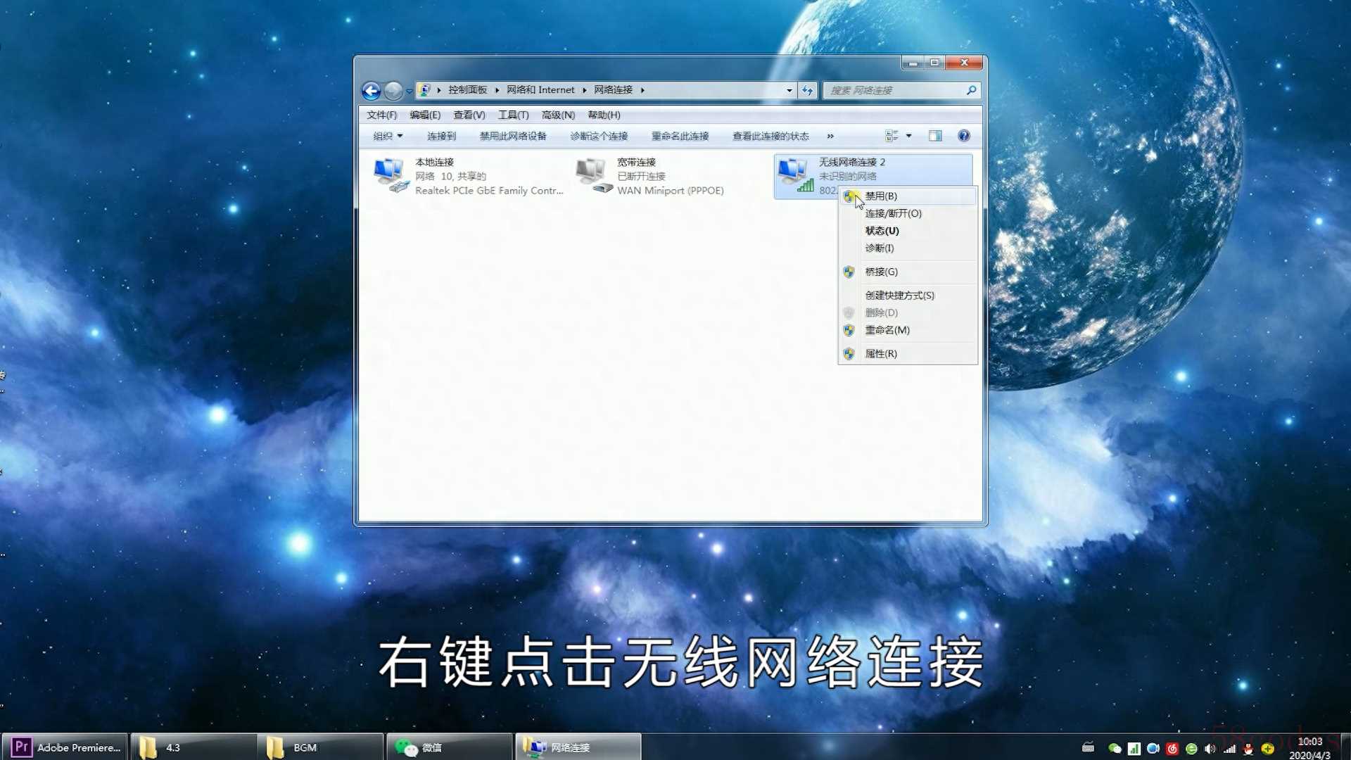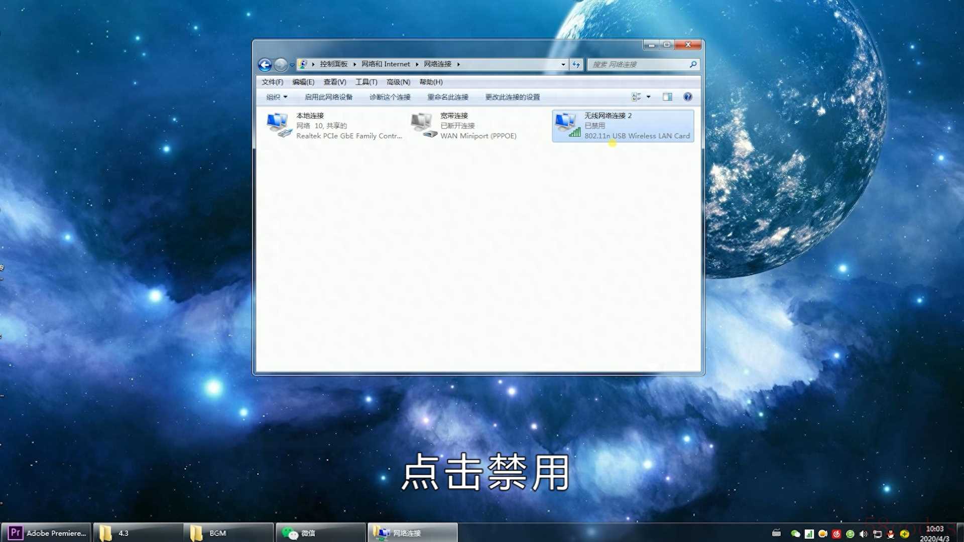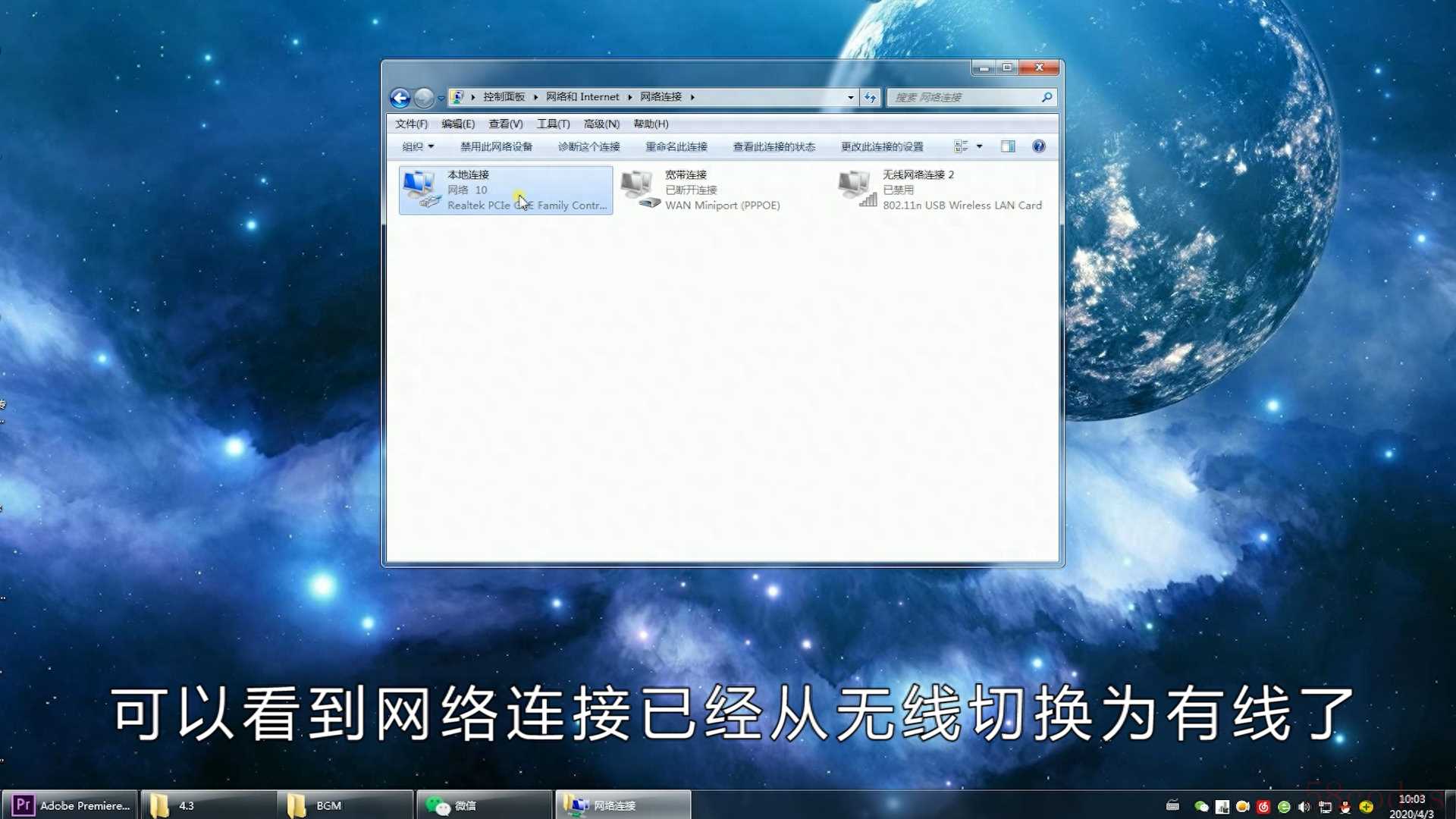 1.首先点击任务栏中的网络连接图标|||2.点击打开网络和共享中心|||3.点击更改适配器设置|||4.右键点击无线网络连接|||5.点击禁用|||6可以看到网络连接已经从无线切换为有线了