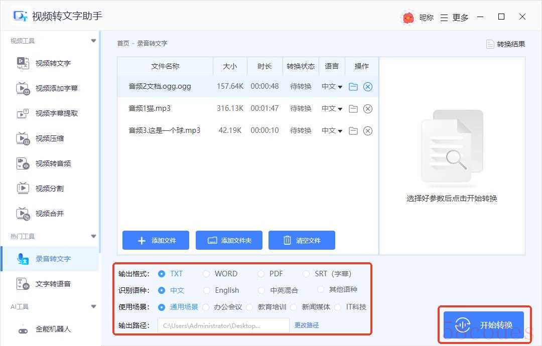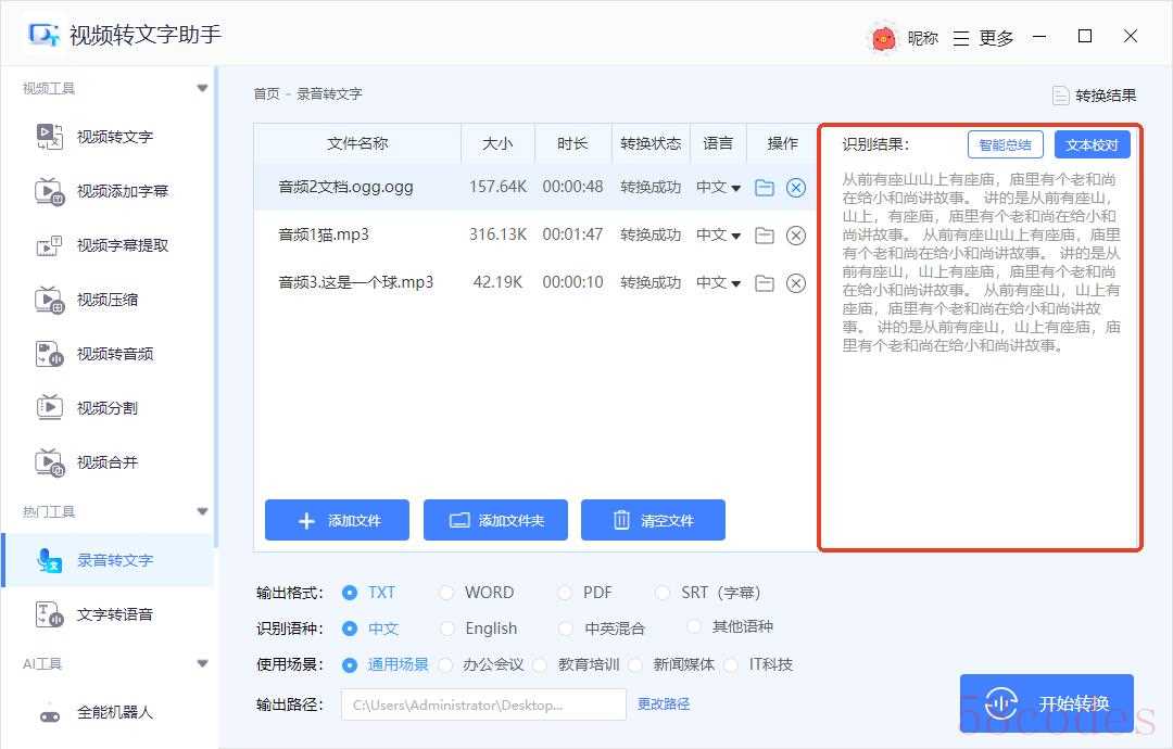 导入音频后,设置输出格式、识别语种、使用场景以及输出路径,然后点击【开始转换】,软件可以清晰的识别录音中的人声,转换成文字。