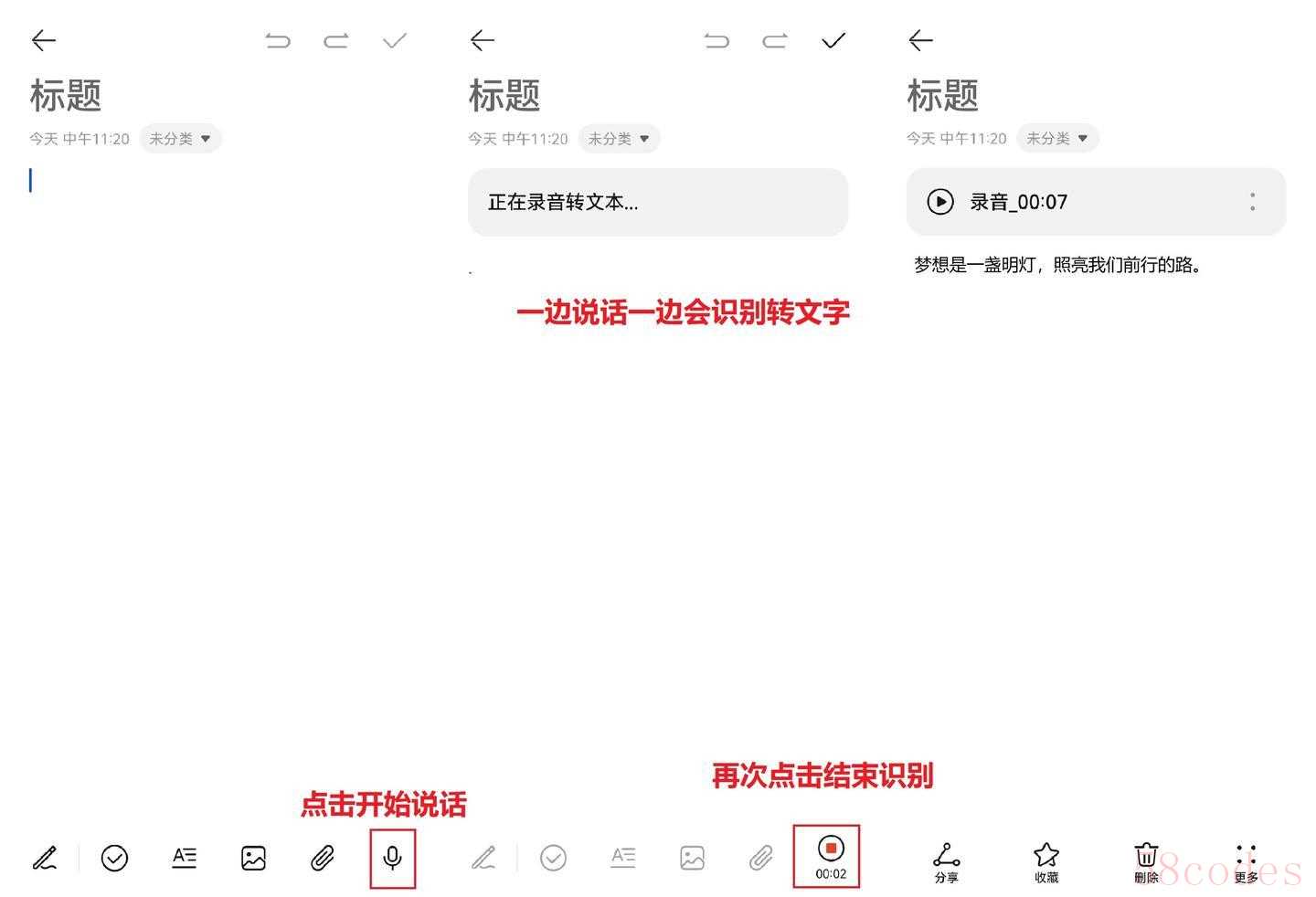 手机备忘录其实也可以将录音转换成文字,操作也不难,只需要打开一个笔记、点击麦克风的标识就能在录音,可以一边说话一边识别并转换成文字,再次点击后就能结束识别,录音的音频下方会自动出现转换后的文字。
