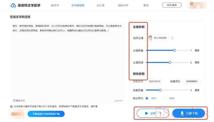 设置右侧的主播参数和其他参数,调整后可以试听,最后点击【立即下载】就能将转换后的语音保存到本地。