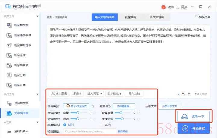 可以导入文档,也可以直接在文本框中输入文字,然后设置语音类型、背景音乐、语音速度和音量等,设置之后还能试听,如果不合适还能重新调整,减少二次转换的概率,提高效率。