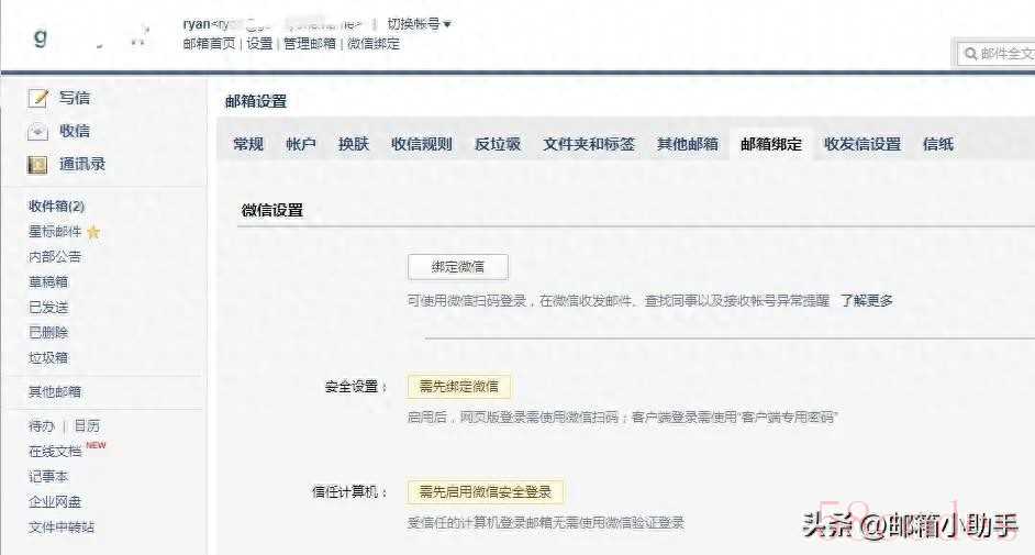 ❶企业成员登录邮箱后,选择弹框的“微信绑定”入口或者进入“设置”→“邮箱绑定,点击“绑定微信”;