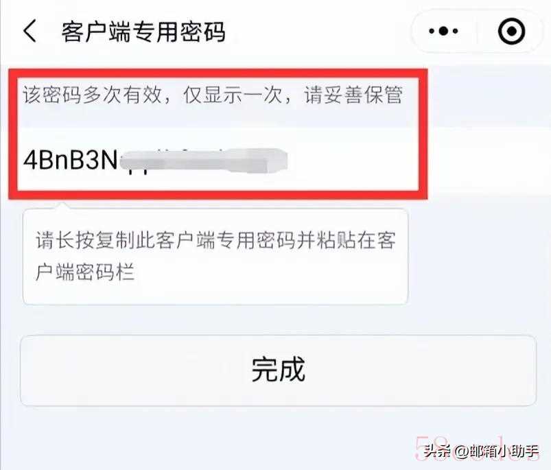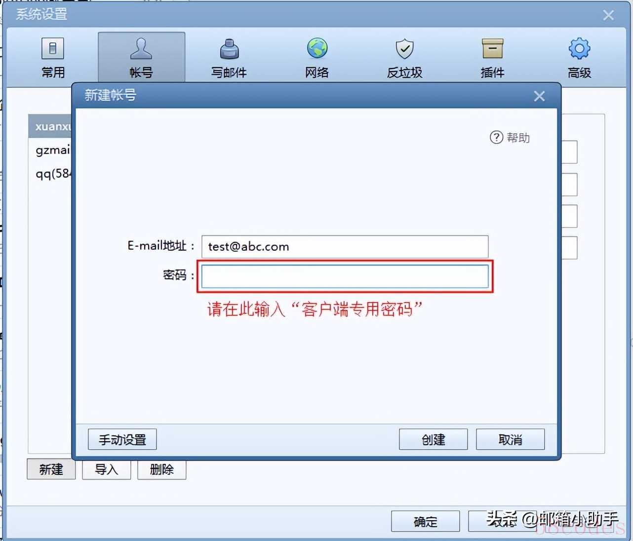 ❹生成密码后,在客户端端登录的时候在密码看输入该“客户端专用密码”,下面以Foxmail为例(如下图所示);