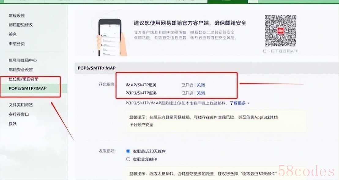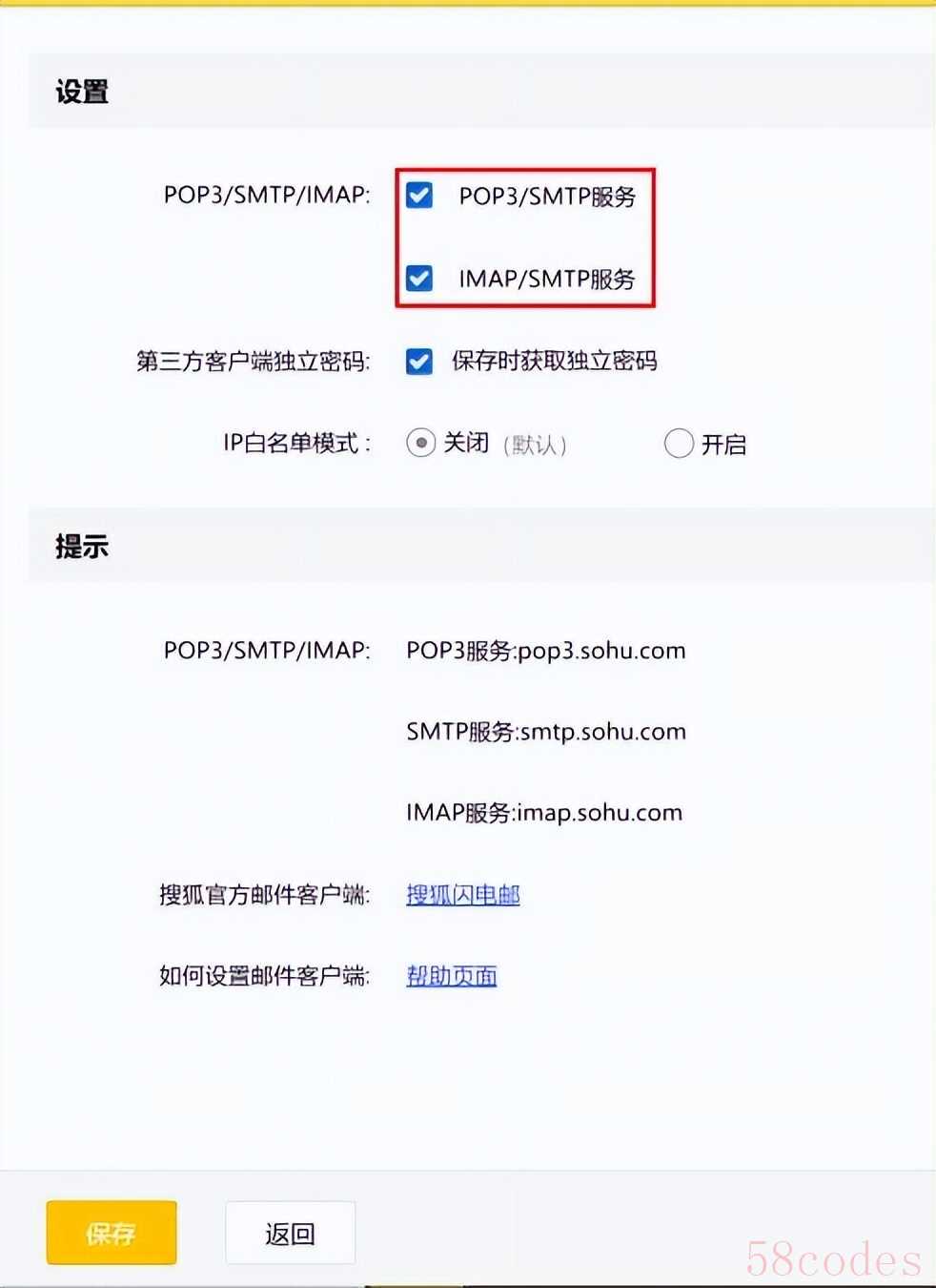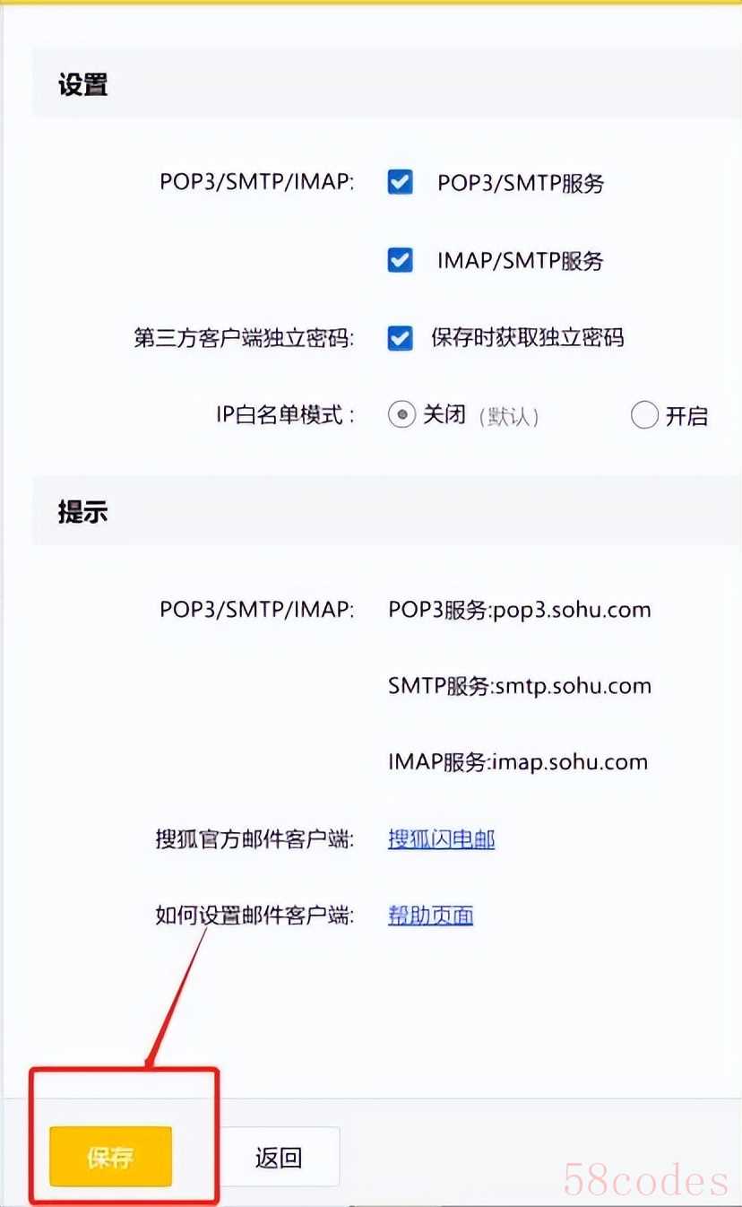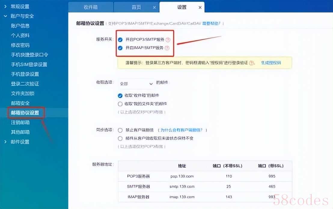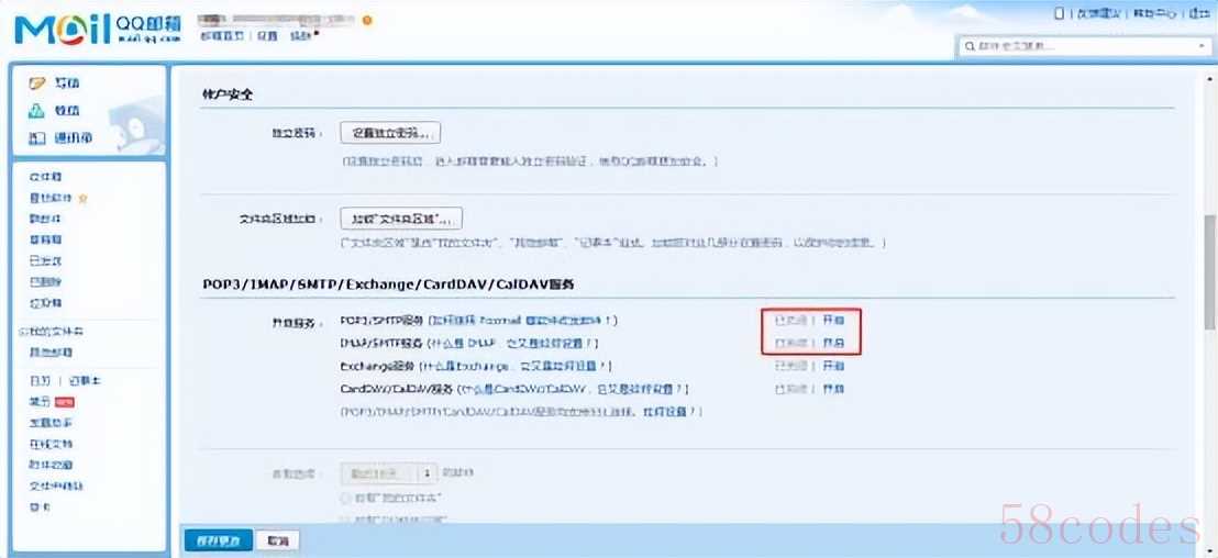 4、进入【设置】页面,分别勾选开启 POP3/SMTP 服务和 IMAP/SMTP 服务,点击 【保存】按钮。