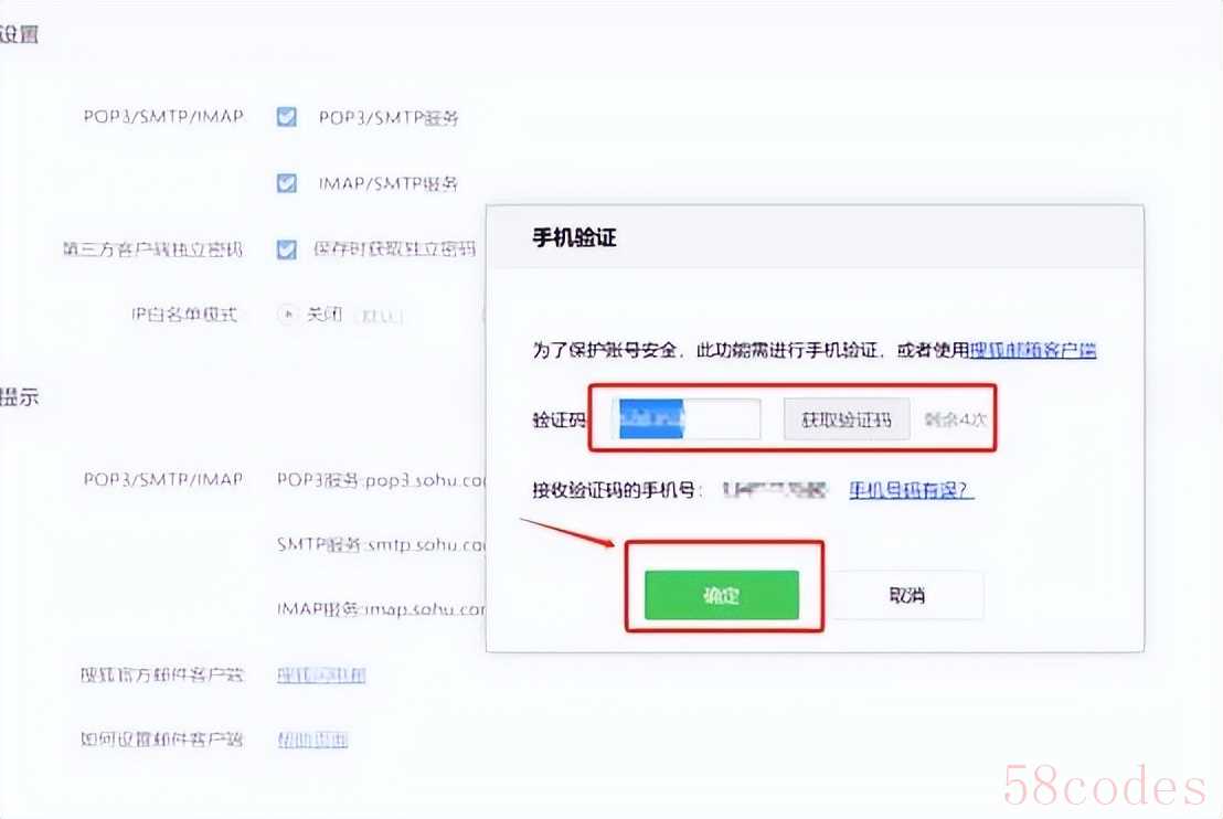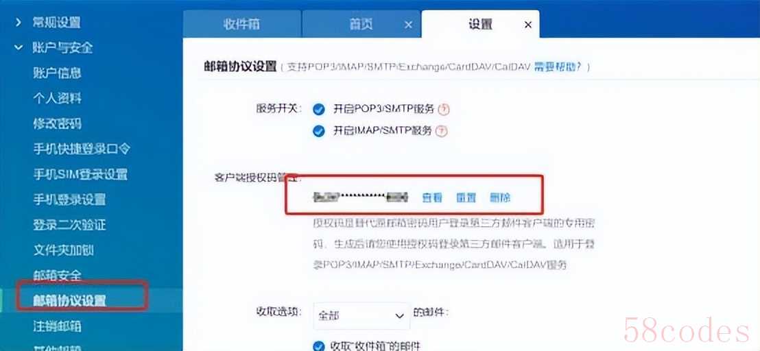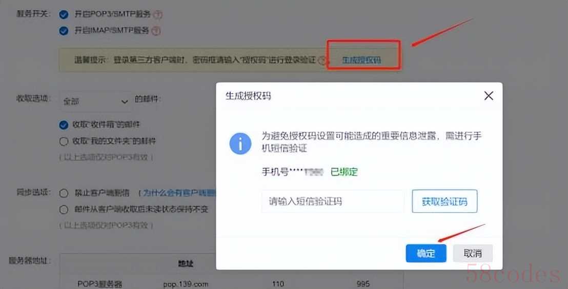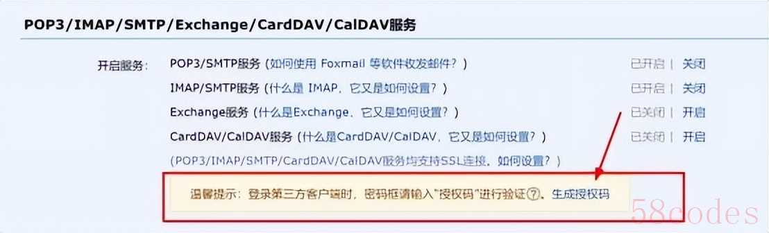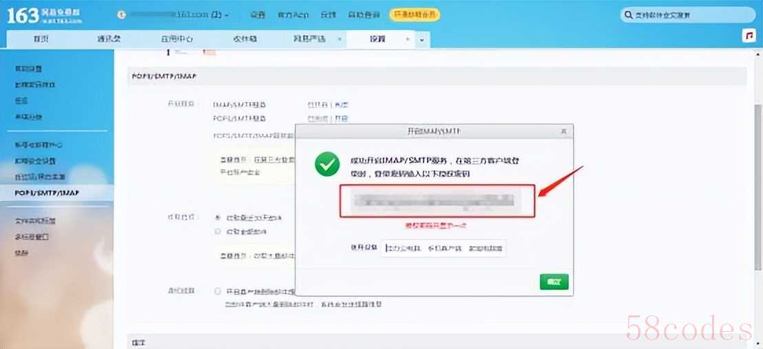 3、将页面中 POP3/SMTP 服务和 IMAP4/SMTP 服务全部开启, 发送短信后, 将授权 码复制出来。