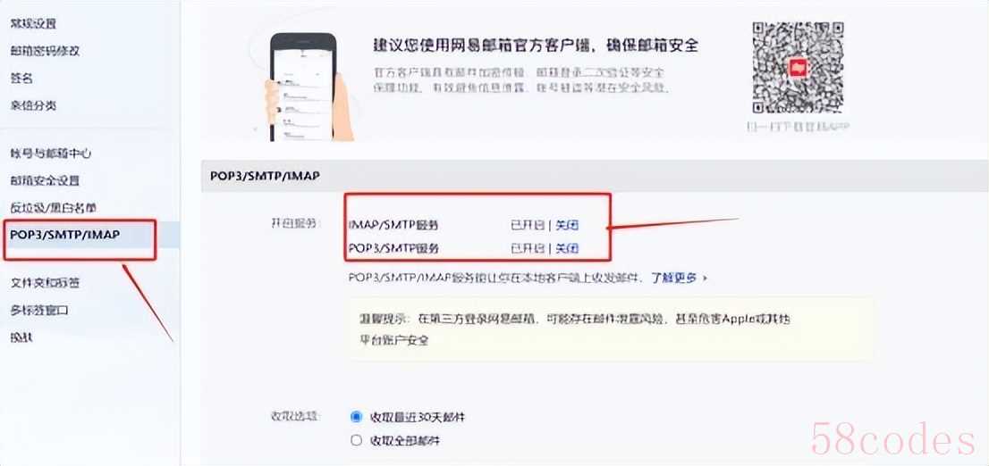 3、点击进入【POP/IMAP/SMTP】页面, 勾选开启 POP3/SMTP 服务和 IMAP4/SMTP 服务
