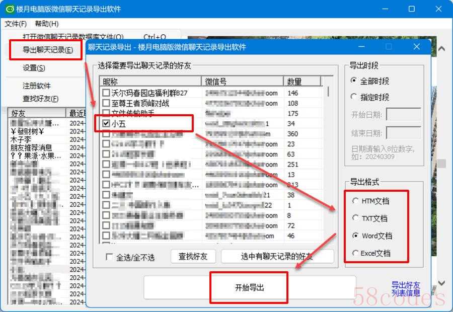 通过顶部菜单栏选择"文件","导出聊天记录",在弹出的对话框中选择需要导出的对话对象(支持多选),然后根据需求选择输出格式: