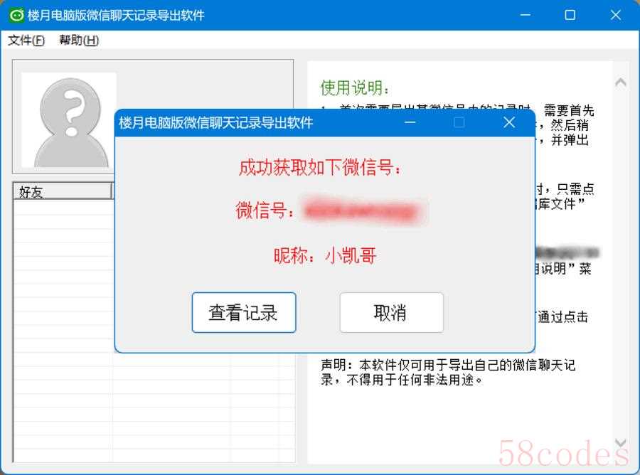 运行楼月电脑版微信聊天记录导出软件,系统将自动扫描并识别当前已登录的微信账户信息。这个过程通常需要5-10秒,待界面显示账户标识后,点击"查看记录"进入主操作界面。