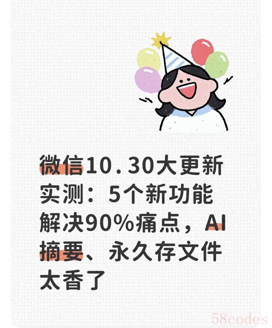 10月30日,微信悄悄推送了8.0.45版本更新,一口气上线5个实用功能。试玩一整天发现,这次更新根本不是简单的"补丁"——从群聊99+消息的AI摘要,到过期文件的永久保存,每一个都精准踩中打工人和日常使用者的高频烦恼。不少用户更新后直呼"微信终于肯听劝了",但也有隐藏技巧和注意事项藏在细节里。今天用大白话结合实测体验,把每个功能的用法、场景和坑都说透,看完就能直接用。