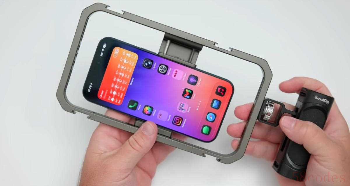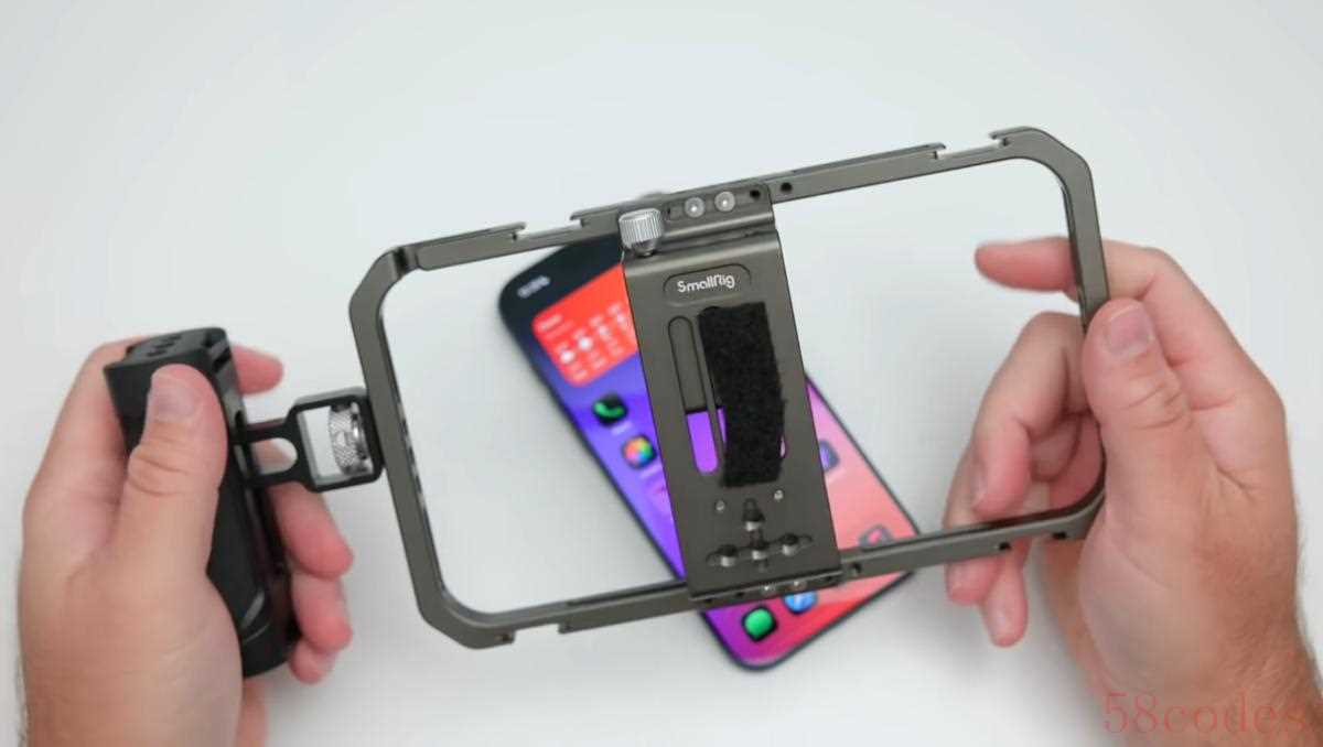 如果在工作室用 17 Pro Max 拍视频,我会搭配几个配件,其中一个就是手机兔笼。这个兔笼是我之前从斯莫格(Small Rig)买的,背面贴了魔术贴,还带个手柄,另外还有一个备用手柄。用的时候把 iPhone 夹进去就行,两侧有软垫保护手机,拧紧这里的夹子,手机就能固定得很稳,之后就能拍视频了 —— 不管用前摄还是后摄,都有稳定的支架,还能接之前说的麦克风,或者外接存储设备拍 ProRes RAW 格式的视频。