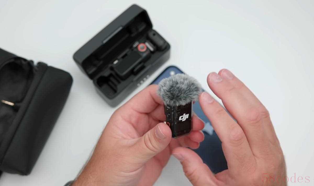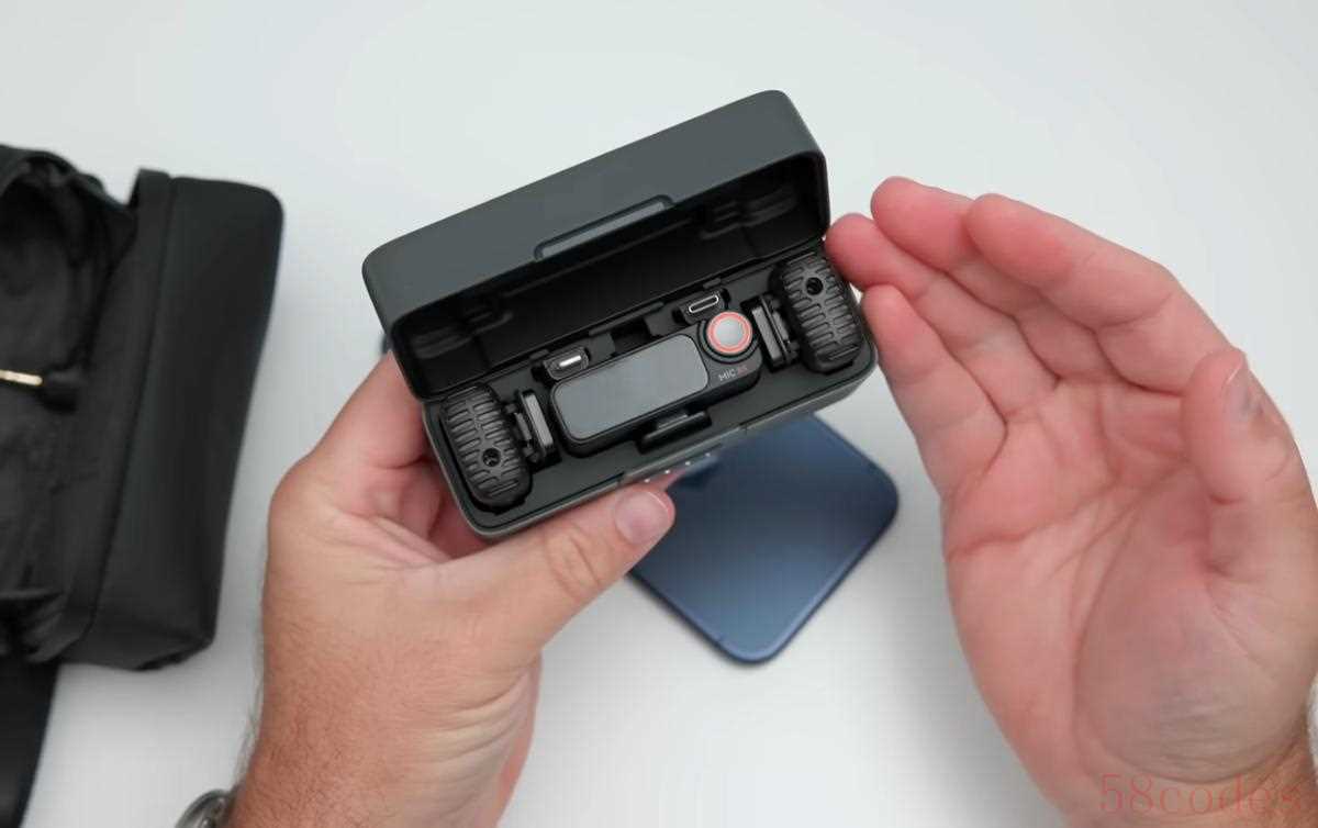 虽说前面提了三脚架,但外出时我还会用麦克风 —— 有时候 iPhone 自带麦克风效果不好,或者遇到大风天气,这时 DJI Mic 2 就派上用场了。这款麦克风我也用了好几年,现在有不同版本可选,价格大概 300 美元左右,实用性很高。它是无线麦克风,你们看,这里有磁吸设计,能吸在衣服上,也能直接夹着用,特别方便。它可以直接连这个接收器,再插 iPhone 使用,但我一般不用接收器 —— 因为麦克风本身就带录音功能,录完后用 USB-C 线连电脑或剪辑设备,就能把音频导出来,和 iPhone 或相机拍的画面同步,特别好用,我非常推荐。