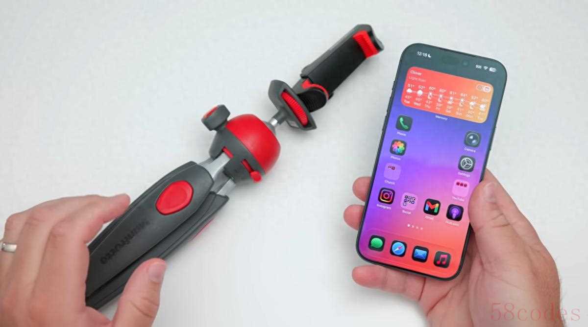 它的底部支架可以像这样展开腿,放在地上使用。侧面有个小开关,打开后还能让支架变得更平。我用它拍横屏和竖屏视频都很方便,只要松开这里的夹子,就能调整角度。把 iPhone 这样放进去,调平后锁死,确保手机卡紧,之后就能随意调整倾斜方向 —— 想俯拍、拉长支架都可以,在狭小空间里拍东西特别好用。每次户外拍摄我都会带它,既方便又小巧,旅行时塞进背包就行。要是不想用它夹 iPhone,还能把顶部的支架拆下来,换成其他相机,它有标准的三脚架接口,通用性很强。这玩意儿质量是真的好,我揣包里用了好几年都没坏,完全没必要换。我会把它的链接放在简介里,大家可以去看看。