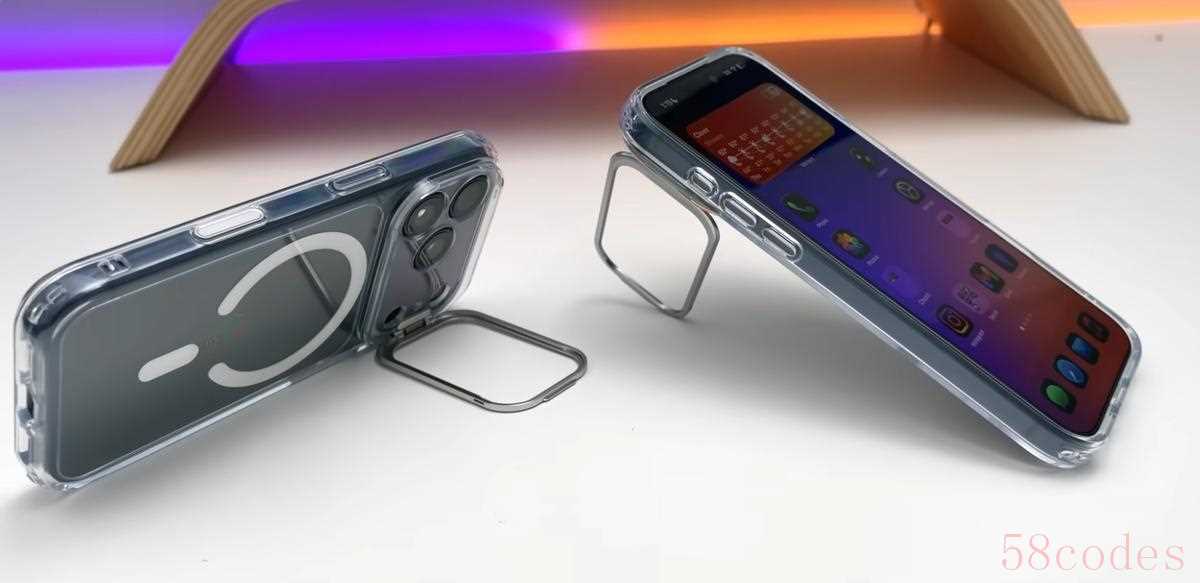 这个镜头保护盖还能当支架用,角度能在 15° 到 69° 之间调节,竖屏、横屏模式都能用。手机壳背部很薄,只有 1.5 毫米,充电效率更高,而且支持 MagSafe,磁力有 1500G,比大多数手机壳强两倍。
