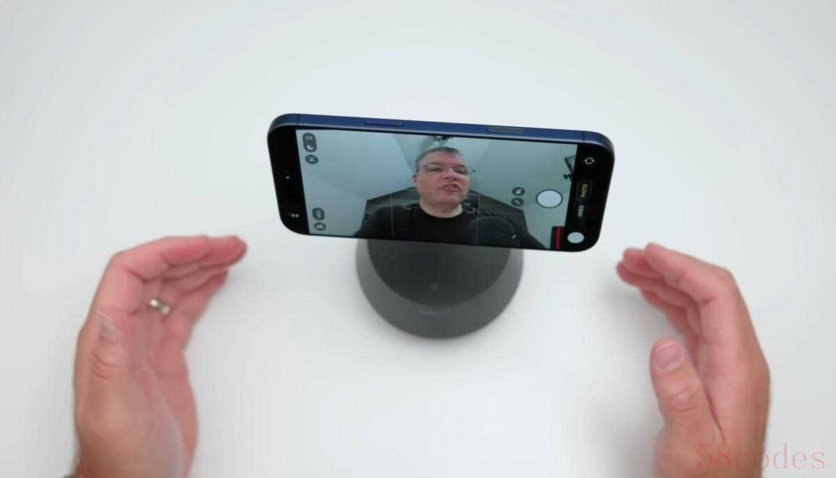 配置完成后,支架可以竖放,我把镜头拉远一点,打开相机,你们看,它会自动把我框在画面里。我移到这边,它会跟着转;往上挪,它会抬头;往下移,它会低头。横屏模式也能用,把手机横放,它会调整角度让我在画面中间,我再移动,它也会跟着动。这个配件虽然有点贵,但很好用,而且用的时候还能给手机充电。不管是开视频会议,还是画面里有多个人,它都能识别并跟踪,特别方便。