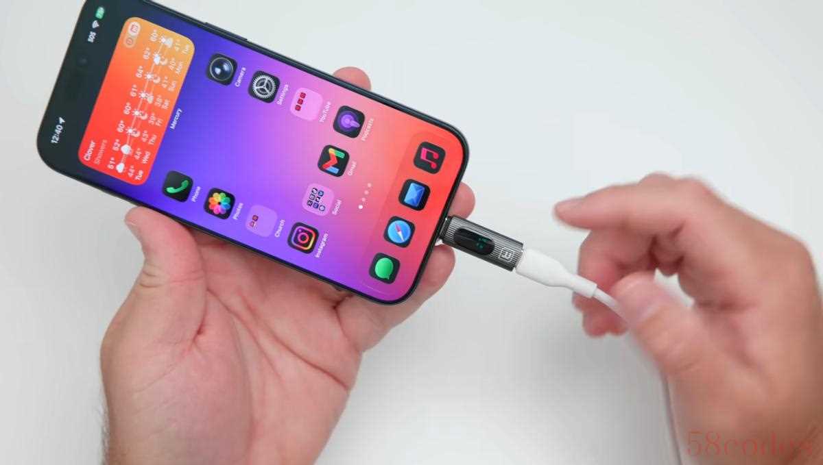 另外两个配件是我拍视频时常用的。一个是功率检测仪,我在亚马逊上买的,用 USB-C 接口连接,能显示充电速度。比如把它插在 Anker 充电器和手机之间,手机开始充电后,它就能实时显示当前充电功率。