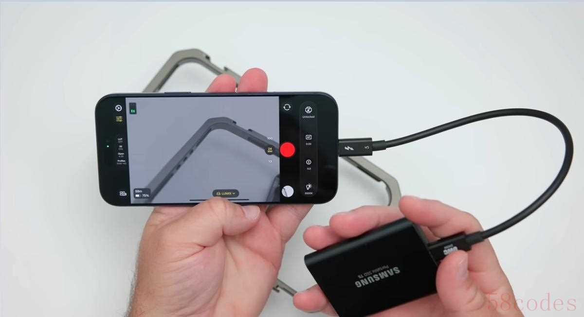 外接存储方面,我用的是旧款三星 T5 移动固态硬盘,1TB 容量的。现在有更便宜的款式可选,都能支持 iPhone 录制。不管用 OWC 的线还是其他线,插上之后,用第三方应用就能拍 ProRes RAW 格式了。比如打开 Final Cut 相机应用,选择 Apple Log 2 录制模式,再在顶部选项里选 ProRes RAW HQ 格式就行,前提是要接外接硬盘。