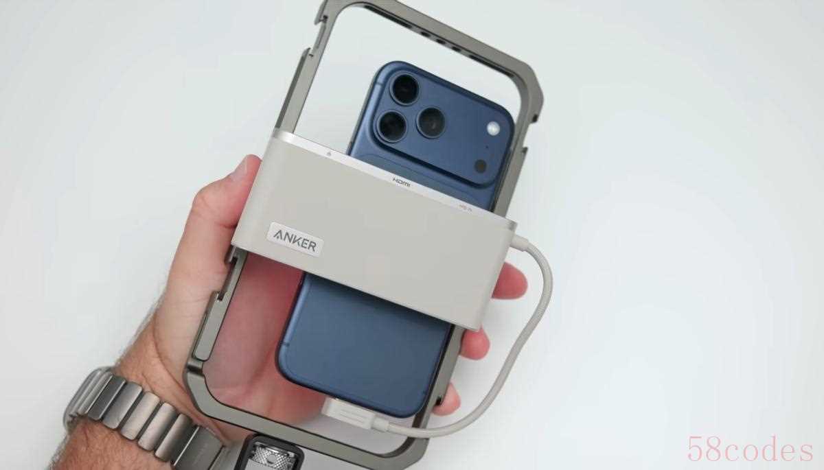 装了兔笼后,我还会接其他配件。比如背面贴了魔术贴,能粘这个扩展坞,插在 iPhone 上,能接不少设备 —— 比如 SD 卡、USB-C 设备,另一侧还有 HDMI 输出接口,能连显示器实时监看,同时还能给手机供电,实现 “边充边录边传”。插好 PD 电源,能看到手机开始充电了;再用线把移动硬盘连到扩展坞侧面,回到 Final Cut 应用,就能直接录 ProRes RAW 格式,还能通过扩展坞的 HDMI 接口外接显示器。这个套装特别好用,要是想把 iPhone 当主力相机用,完全能满足需求 —— 只要注意别让配件挡住镜头就行,整体体验很流畅。