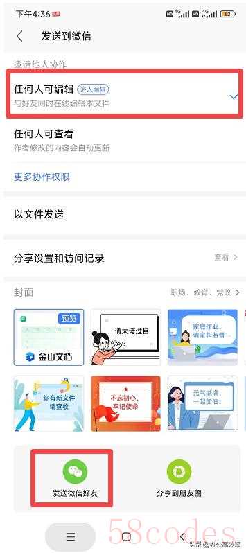 6.如图所示,在“发送到微信”界面中,勾选“任何人可编辑”项,点击“发送微信好友”按钮。