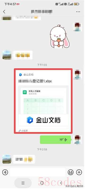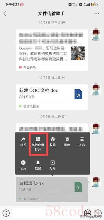 2.按下来打开微信聊天记录对话框,找到想要进行分享的文档,点击并使用WPS Office打开进行查看。可以长按对应的文档,从扩展面板中选择“其它应用程序”项。