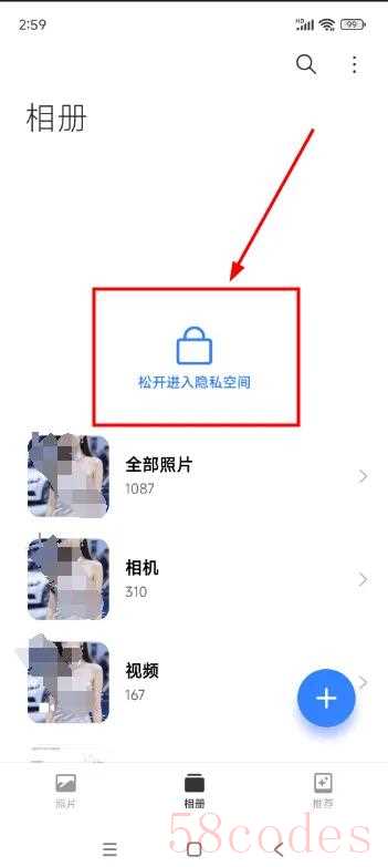 就在这里有一个隐私相册,咋样?你能找到它吗?是不是翻了半天也看不到,它是隐藏的,当然看不到了。想要打开隐私相册,我们用手指在相册的上端往下滑,安装不要松手,一直往下拉,直到看到一个蓝色的图标,下面写着:【松开进入隐私相册】。记得给自己的隐私相册设置密码哦!二:云相册好多人都想破解手机存储的问题,其实主要就是相册和视频的存储问题,其实这个云相册就是完美的解决方案。我们的手机默认是5个G的免费空间,当然是有VIP服务的,其实对于有需求的用户来说,价格还是蛮实惠的。