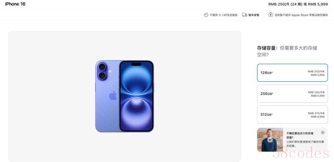 iPhone 16,128GB版本 5999元、256GB版本6999元、512GB版本8999元。