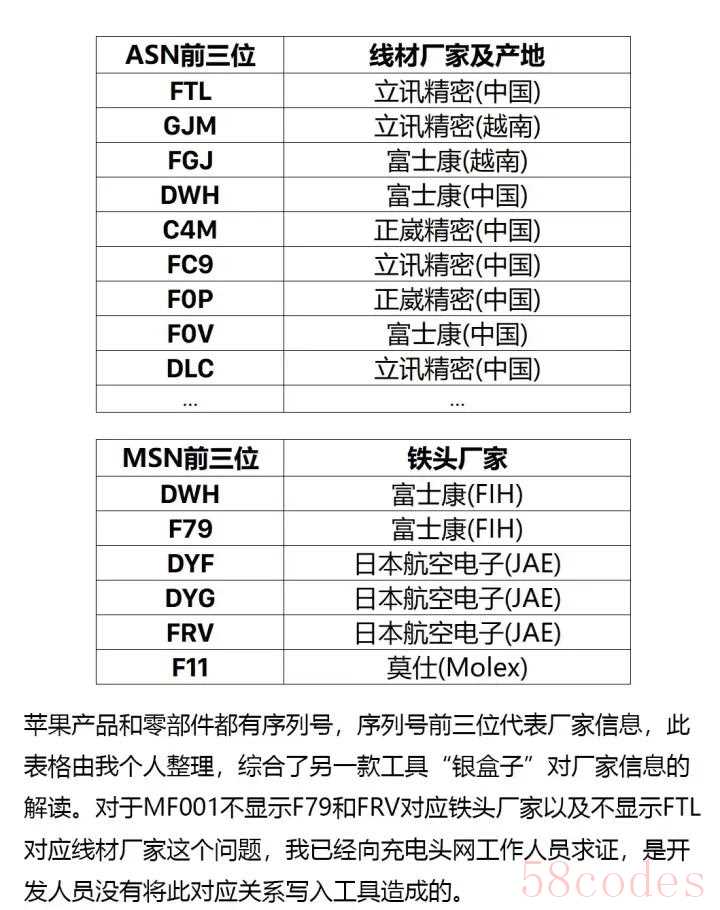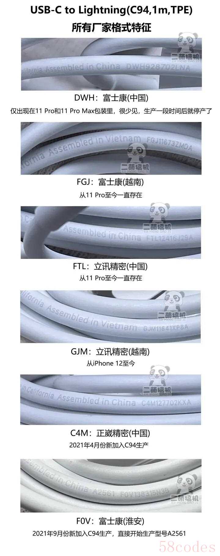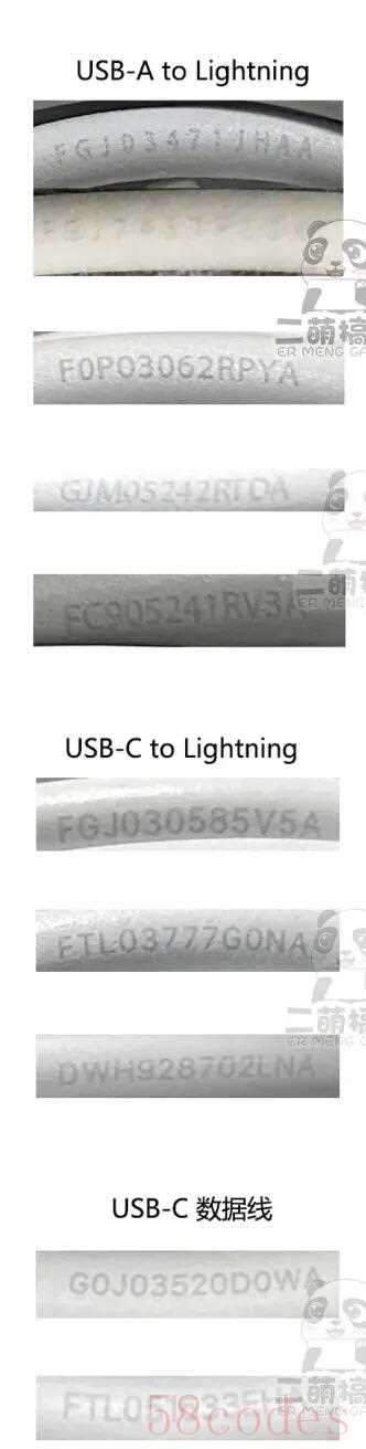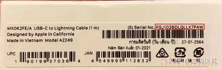 XXXXXXXXXXXX即为序列号,序列号由12位字母+数字组成,每条数据线的序列号都是唯一的,各字母和数字分别代表了厂家和生产时间信息。1. 第1-3位是厂家代码、USB-A to Lightning数据线(1米,E75):主要序列号开头有FGJ、GJM、FC9、F0P、F0V、F0Q以及现在很少见的早期厂家代码C4M、DLC、F4F等(根据观察C4M在2021年又回归生产E75了)。其中FGJ为越南富士康,F0V为淮安富士康,GJM为越南立讯精密,FC9为滁州立讯精密,F0P、C4M为正崴精密。USB-C to Lightning数据线(1米,C94,线上带苹果logo):序列号开头为FGJ、FTL、GJM、C4M(2021年新加入)、DWH(很少见),分别为富士康(越南)、立讯精密(中国)、立讯精密(越南)、正崴精密(中国)、富士康(中国)。2021年9月21日新补充:为了方便鉴别,我不得不提一下老款快充线——USB-C to Lightning数据线(1米,C91,线上无苹果logo):序列号开头为FTL、FC9、DLC,全部是立讯精密产的,特别注意:原装的DLC快充线是不带苹果logo的,带苹果logo的DLC快充线一定是假的,具体原因请看这篇文章USB-C数据线(iPad Pro自带线,1米,C-C):序列号开头有FTL和G0J,FTL为立讯精密,G0J目前未知。据我所知,以上代码和厂家的对应关系来自网络流传,一些测试工具也使用这套对应关系,这个和手机序列号前三位对应哪个代工厂一样,不是官方数据。2.第4位代表生产年份,如2代表2012年,8代表2018年,0代表2020年,1代表2021年,到了明年2022年又会变成23.第5、6两位代表生产周数,一年不会超过53周,所以这两位数字不会超过53,只能是01~534.第7位代表星期几生产,只能是1~75.第8~11位为随机码,无意义,不用理会6.第12位只能是A B C,目前我只在USB-A to Lightning数据线上见过C,主要是2016年-2019年的数据线上有A和C,目前所见2020年和2021年产数据线都是A。对于USB-C to Lightning线,一直都是A,直到2021年9月,在新款快充线A2561上出现了B