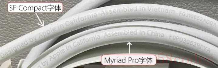 USB-C to Lightning快充线固定使用SF Compact字体,USB-A to Lightning数据线固定使用Myriad Pro字体。2.格式Designed by Apple in California和Assembled in China是两句话,所以他们之间有两个空格。