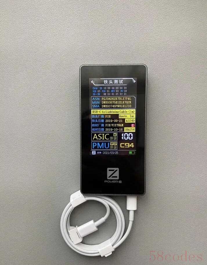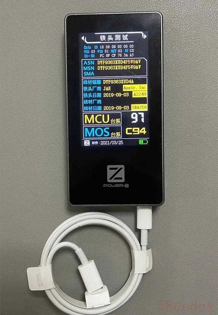 此设备购自淘宝店“充电头网”,型号为ChargerLAB POWER-Z MF001,可以测试Lightning头的认证序号类型、认证芯片类型、开关芯片、评分等信息,支持测试苹果原厂Lightning头,台系、山寨Lightning头,支持C48、C52、C68、E75、C91、C94、C100等Lightning头的测试。