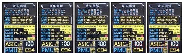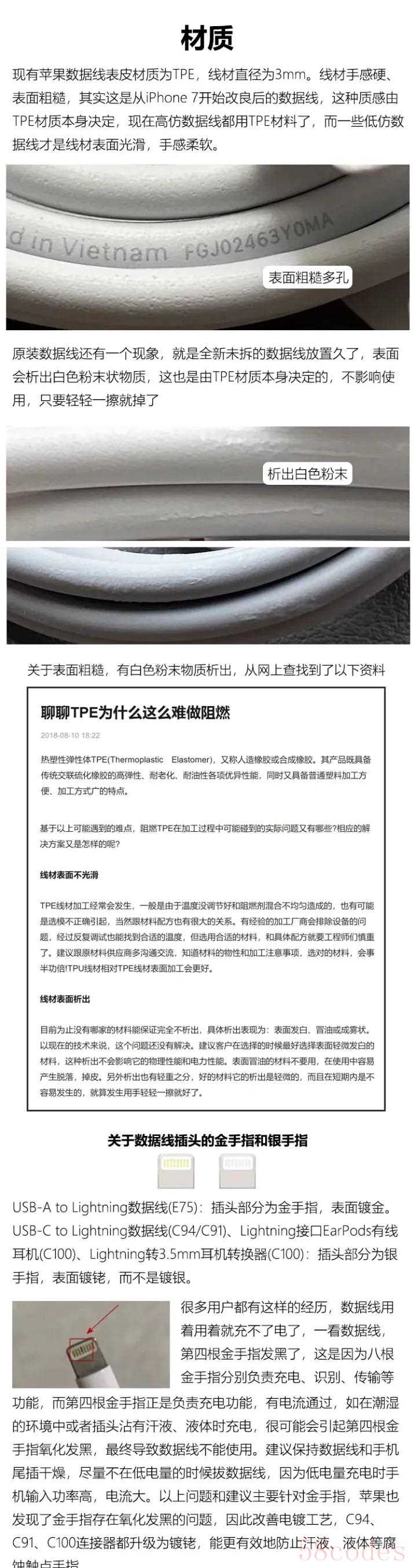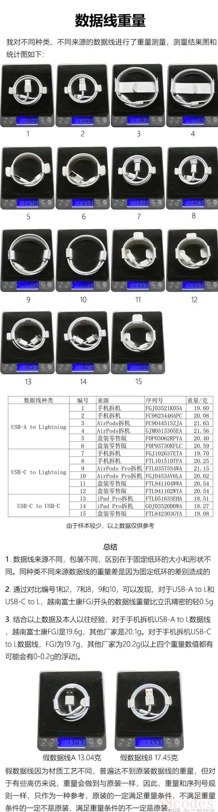PMU:Power Management Unit电源管理单元,即开关芯片,VP:Voltage Protect过电压保护,CP:Current Protect过电流保护评分:只有当认证芯片和开关芯片都为原装时才会显示100分铁头型号:原装USB-A to Lightning数据线为E75,原装USB-C to Lightning数据线为C94或C91,原装Lightning接口耳机为C100,原装Lightning转3.5mm接口耳机转换器为C100重要事项:1.对于原装数据线,不仅要保证认证芯片和开关芯片原装,还要记录完整的铁头和线材生产信息。2.铁头和线材来自不同的供应商,而且先有铁头成品,线材供应商才能将铁头加工成数据线,因此ASN和MSN两个码肯定是不一致的,MSN日期信息要早于ASN。(上一节最后那条DYF数据线线材日期和铁头日期一致,也说明那条数据线是假的)3.严格来说铁头厂商代码(MSN前三位)和线材厂商代码(ASN前三位)不一致,也就是DWH、DYF、DYG、F11、F79不会变成线材序列号前三位,如果你看到数据线上序列号开头是DYF或DYG之类的,那肯定是假线(上一节字体与格式部分最后那条DYF开头的数据线就是这样被死刑的)但是有一个例外,就是DWH,同时出现在假线和原装之中,iPhone 11 Pro/11 Pro Max自带快充线里存在序列号DWH开头,DWH是唯一一个同时用作线材厂商和铁头厂商的代号。大部分DWH数据线均为假货,只有少数是真的,遇到DWH数据线,需要进一步从字体格式甚至要借助仪器才能确定真假。