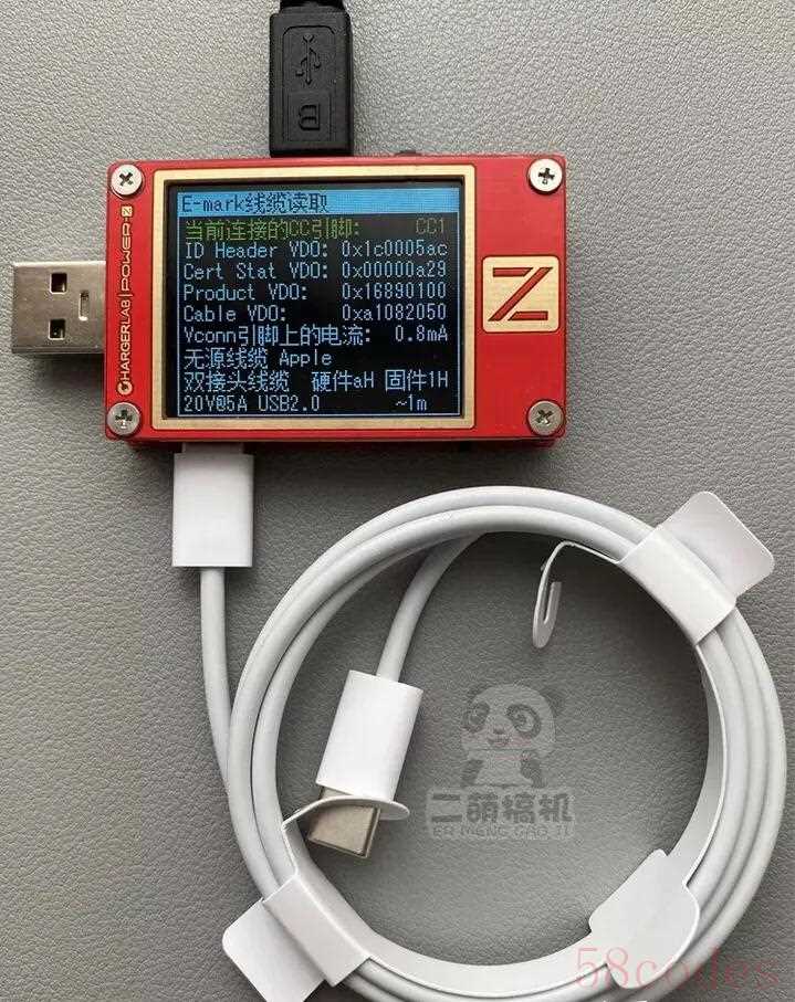 对于USB-C数据线,因为没有Lightning头子,因此无法使用上述工具来测试。苹果原装USB-C数据线双头都带有E-Marker芯片,支持20V 5A,最大100W充电。通过ChargerLAB POWER-Z的另一款工具KT002,我们可以读取E-Marker芯片里的信息:Apple、双接头线缆、20V@5A、USB2.0、长度1m。此数据线为iPad Pro或iPad Air 4拆机1米数据线,与MacBook Pro自带2米充电线相比,只是线材细一些,其他参数如20V 5A,USB2.0等都相同,官网介绍两者兼容设备也完全相同,因此此数据线也适用于Mac(包括iMac、Mac Pro、MacBook Air/Pro、Mac mini),别看它细就以为它承载不了100W的功率。