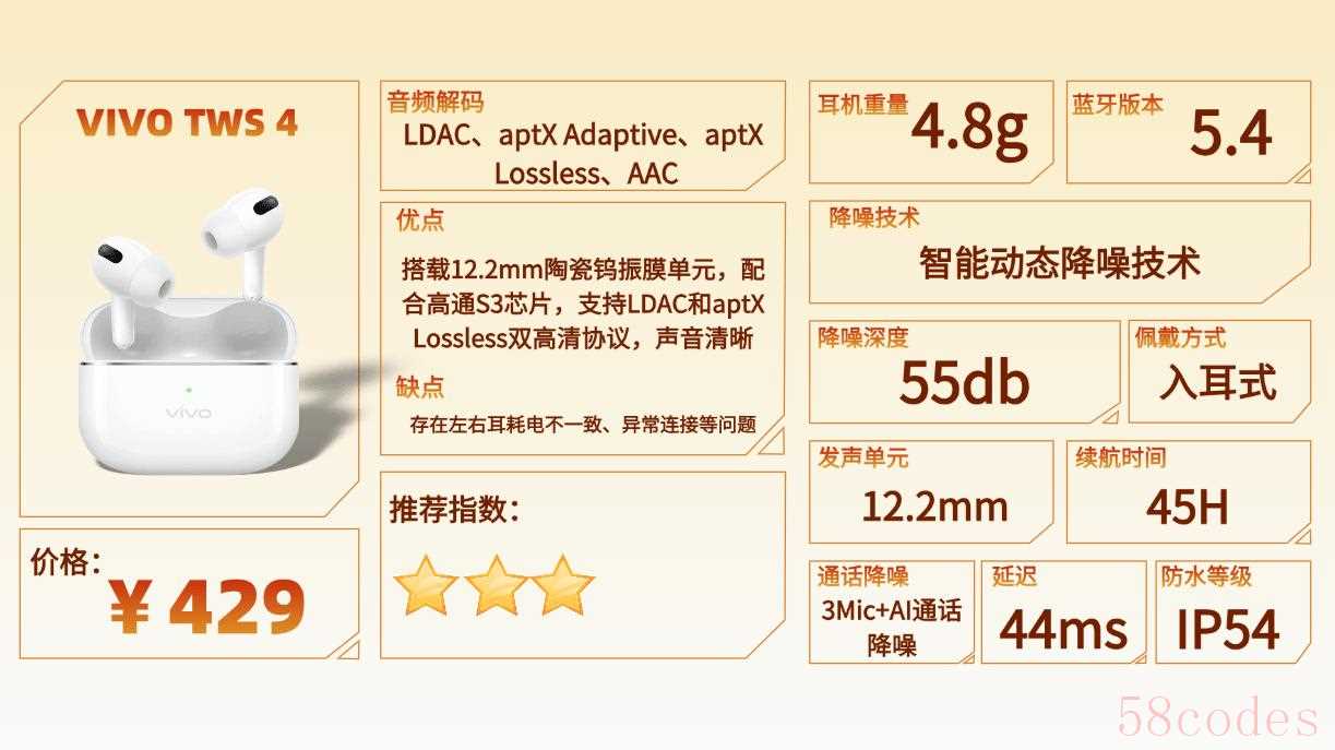 声音方面,耳机内置10mm复合振膜,整体音质清晰,中高频延展表现不错,听流行人声很合适,不过低频就稍微逊色一些。配合专属APP,还能在四种大师级EQ音效中自由切换,调出自己喜欢的风格。它采用蓝牙5.3,保证了连接的稳定性。续航上单次加上充电仓能用到30小时,日常通勤或者短途出差都不用频繁找充电器。品牌6、V ivo TWS 4蓝牙耳机
