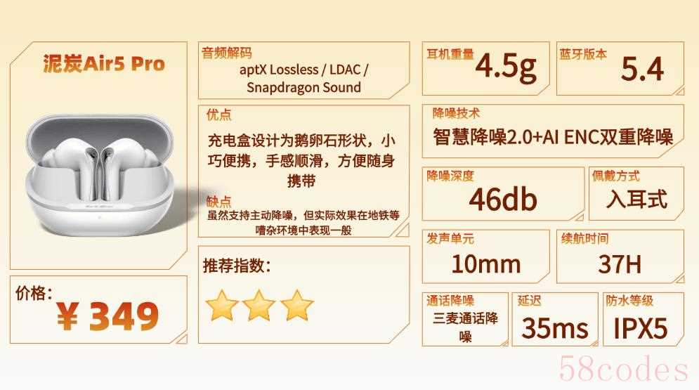 音质方面,配备的是ACAA 4.0同轴双单元(10.5mm+4.6mm),低频能量感突出,下潜深但氛围略显重,中频人声的解析力表现优秀,高频部分延展自然。支持LDAC高清传输与空间音频,听感沉浸感强烈,更偏向喜欢电子、摇滚、流行的用户。蓝牙升级到5.4版本,连接速度和稳定性表现出色。续航方面,在关闭降噪的状态下最长可达48小时,通勤出差都不用频繁充电。品牌4、泥 炭A ir5 Pro蓝牙耳机